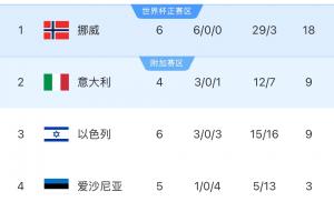 I组第二名意大利四轮后积9分,只要意大利在今天晚些没能战胜爱沙尼亚,并且下轮也没能战胜以色列,那么挪威将直接晋级2026年世界杯。