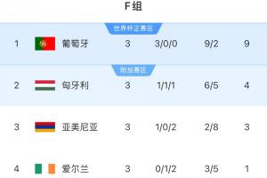 赛后,积分榜情况,葡萄牙3连胜积9分,排名第一;匈牙利4分第二、亚美尼亚3分第三、爱尔兰只有1分排名垫底。