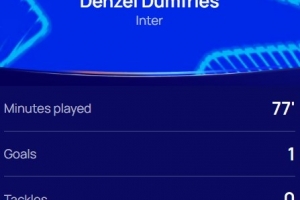 本场比赛中邓弗里斯出场77分钟,打进1球,10次赢回球权,冲刺速度最快32.5km/h,赛后他也当选欧冠官方评选出的本场最佳球员。